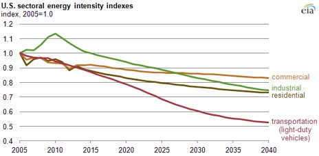 Most Energy intensity trends show a decrease regardless of location. The following graph is provided because of reliable data provided by a known organization. Other data compared energy use compared to countries GDP over time and showed similar results This graph is especially useful because it compares different industries. The reference point is energy intensity in 2005 as unit. Portions of it are projections based on current trends, the spike correlates with the recession of 2007-2009.