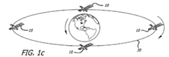 Another patent—“System and Method for Observing a Satellite Using a Satellite in Retrograde Orbit” by Ian Robinson and assigned to the Raytheon Company in 2012—describes how a system of satellites at GEO altitude could observe the rest of the GEO environment efficiently. Robinson described a system of N satellites equally spaced in retrograde geosynchronous orbit.<ref>Ian Robinson, System and Method for Observing a Satellite Using a Satellite in Retrograde Orbit, US Patent US 8,090,312 B2, filed October 3, 2006, and issued January 3, 2012.</ref> Each satellite in this constellation would transit the entire GEO belt twice per day and thus briefly re-visit all prograde-orbit GEO satellites every 12/N hours with a relative velocity of approximately 6.1 km/sec. This high relative velocity enables the efficient use of radar systems to detect other satellites in GEO and over time, determine their precise orbits. Figure P2 (labeled Fig. 1c in the patent documentation) is an illustration of the proposed sensor architecture for N=4 satellites.