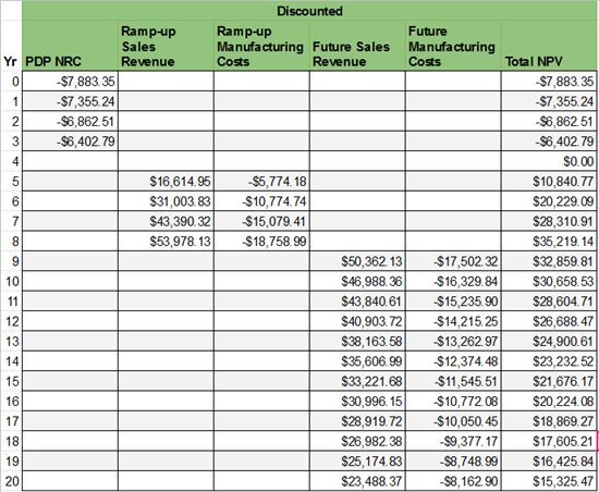 We then discounted future cash flows (both negative and positive) by a cost of capital of 7.8%. This led to the NPV table shown below.