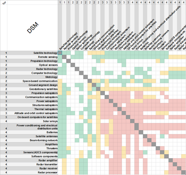 The detailed DSM shows connections between the various technologies comprising our SSA payload (marked with green), as well as hierarchical relationships between technologies and objects (yellow), and physical relationships between components or subsystems (red).