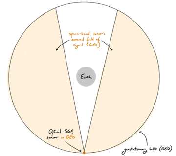 This patent search reveals the potential for a new SSA architecture that could feature our optical sensor payload technology: using an optical sensor on a host GEO satellite to observe both a portion of the GEO belt (the GEO satellite’s neighborhood) and the entirety of the LEO orbital regime. While this architecture cannot observe the entire GEO belt with a single sensor, it can still contribute to broader SSA data collection and perhaps be featured on more GEO satellites, which together can observe the entire belt.