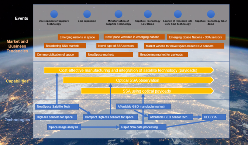 The key level-1 technologies from which SSA derives are satellite technology and remote sensing. The DSM shows a strong interconnection between the various technologies which enable advanced satellite payloads and the coupled nature of the various systems which comprise a remote sensing satellite tasked with SSA/SST.