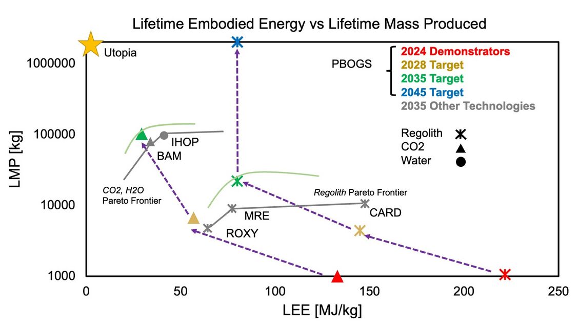 In many cases above, there is not enough current information about the laboratory scale developments taking place to place all technologies in their current context, although many papers include projected metrics based on detailed design studies of scaled-up systems. While these FOMs may be optimistic, they can begin to communicate how these different technologies compare at full-scale implementation to drive investment strategies. Notably, the demonstrator stages focus on the reported performance of the ISRU conversion subsystem. But for estimates of the scaled-up plant, estimates of the oxygen liquefaction and resource extraction energy (like water mining in Lunar permanently shadowed regions [11]) are included in the final estimated values shown in the chart below. Although electrolysis systems are used on Earth, space-based systems have yet to reach the market, so the pilot plant estimates of competing technologies include all technological advancements until the target year of 2035, when these technologies are expected to enter the market at the pilot scale.