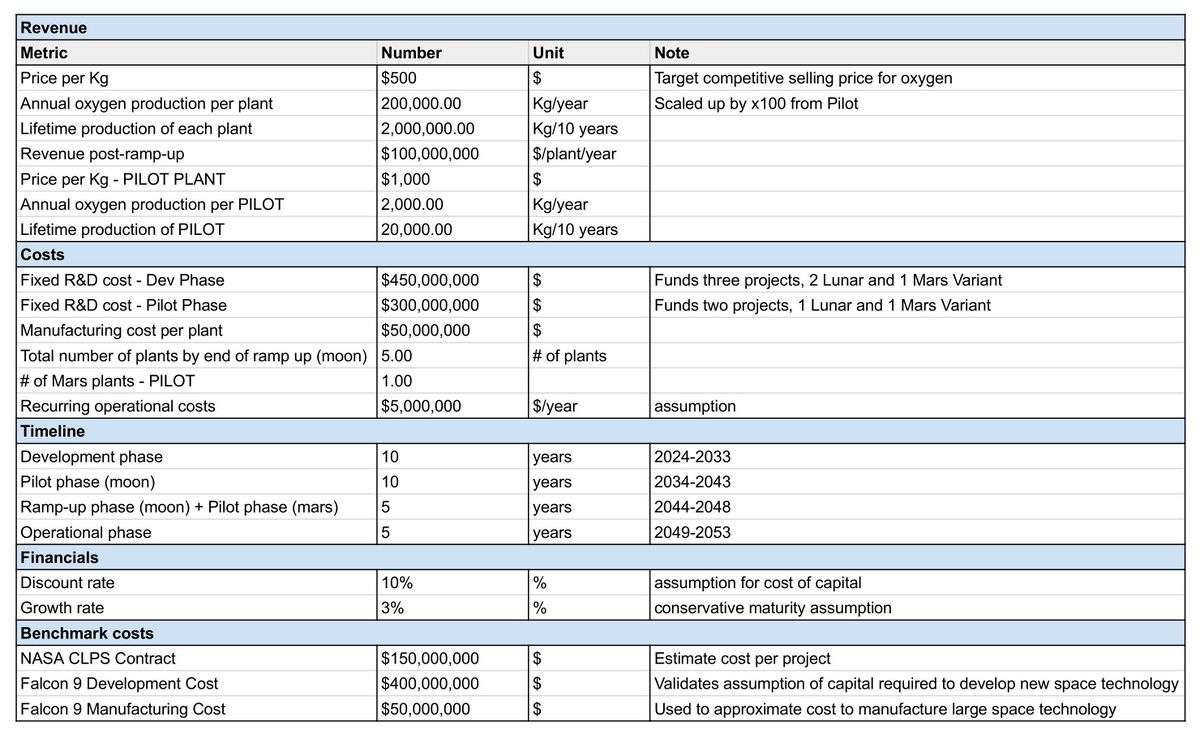 Several key assumptions are incorporated in this financial model. According to a study on a commercial Lunar propellant architecture, the estimated cost per kg of propellant a Lunar customer would be willing to pay is 500$/kg [5]. The full-scale plant production rate, 200 ton per year, established by the 2045 target 3, contribute to a total annual revenue of $200M. Other model assumptions include the approximated development costs based on benchmarks achieved by SpaceX (~$400M for Falcon 9 [19]) and awarded through NASA contracts (NASA Commercial Lunar Payload Service for ~150M [20]), as well as manufacturing and deployment costs ($55M per plant). Operational costs are estimated to be 5M$ a year per plant.
