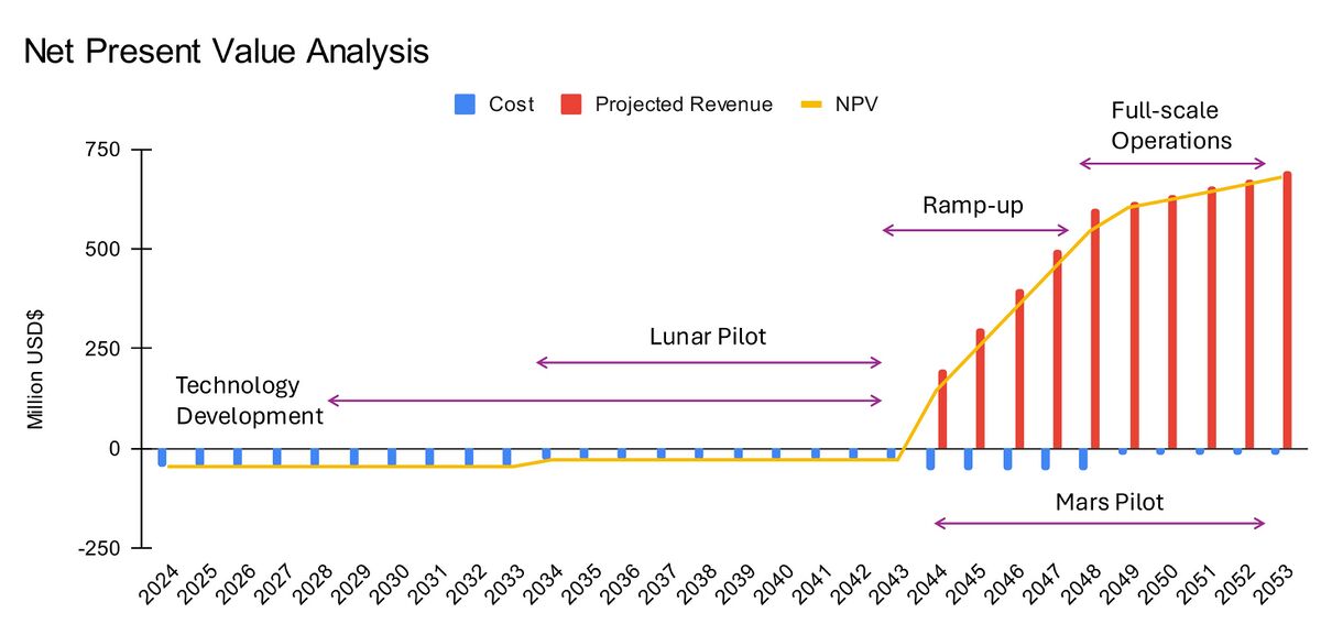 Government support drives the feasibility of this roadmap. NASA contracts and other subsidies will play a pivotal role in offsetting high R&D costs, making the initial phases of the project financially viable. While cash flows remain negative during development and early ramp-up, the transition to operational profitability demonstrates the project’s strong long-term potential, with significant cash flow contributions from both Moon and Mars operations. The project’s ability to scale from a $2M Mars pilot operation to nearly $700M annual revenue by 2053 highlights the effectiveness of phased ramp-up and operational scalability. The $9.72B terminal value underlines the importance of ongoing operations, making up the majority of the project’s total NPV.