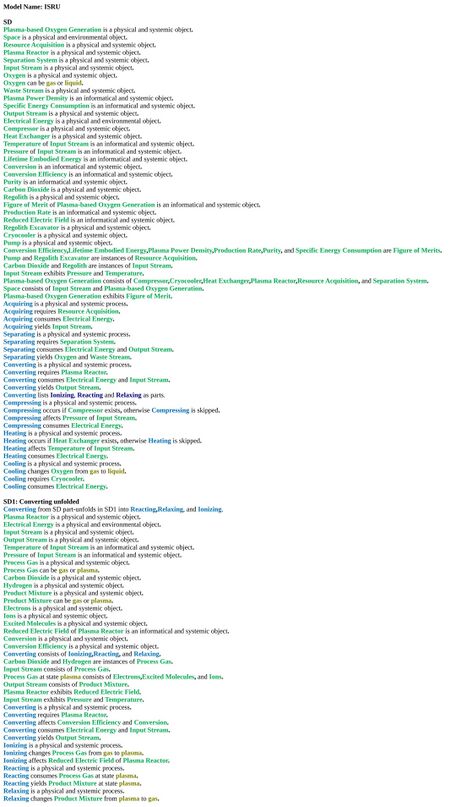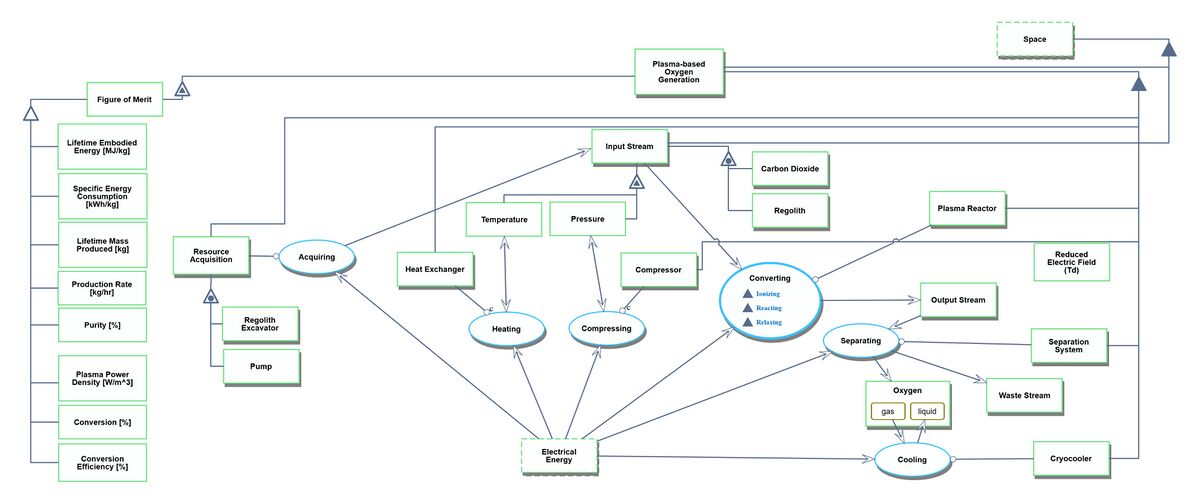 An Object-Process-Diagram (OPD) of the 2PBOGS roadmap is given in the figure below. This diagram captures the main product of the roadmap (level 2) and decomposes the product into four main systems (resource acquisition, environmental control, plasma reactor, and separation) corresponding to level 3 in the DSM and displays the figures of merit (FOMs).
