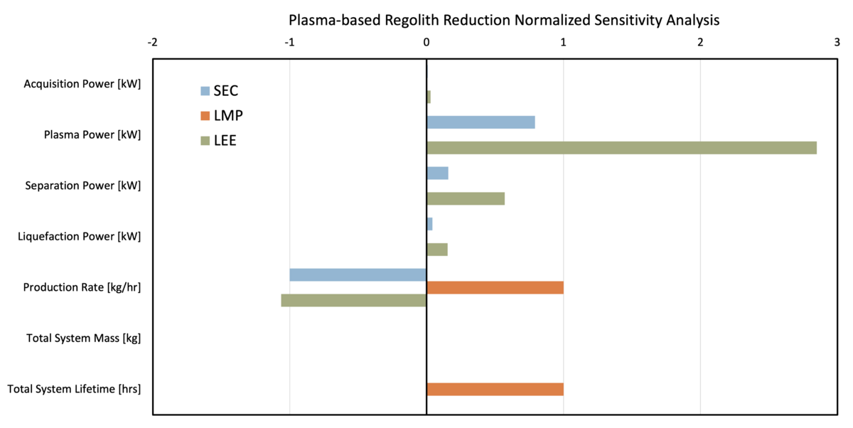 The Lunar variant sensitivity analysis strongly resembles and reflects the tornado model presented for plasma-based Co2 conversion, as they are very similar technologies. The major difference is that the LEE is even more strongly sensitive to plasma power required to produce a certain amount of an Oxygen, and less sensitive to the separation power requirements. This makes sense considering the relative immaturity of the technology (TRL 3) and the lack of active investigation towards optimization in the plasma subsystem, whereas the separation systems for water (water electrolyzers) are more advanced. The model demonstrates the importance of reducing the plasma power required to produce a certain amount of water, which could be accomplished through improving active surface area of regolith, as well as optimizing flow rate and electronic parameters. This high-sensitivity of plasma power strongly motivates performance Targets 1 and 2 and provides focus and direction for building a prototype reactor.