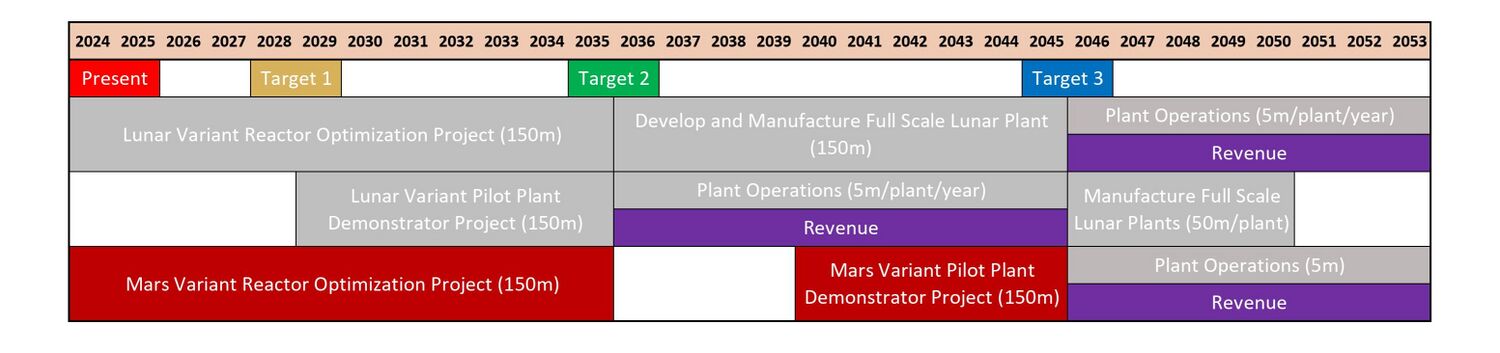 | Lunar Variant Pilot Plant Demonstrator | 2035: rprod = 2 tons/year, LMP = 20 tons | A pilot plant demonstrator is targeted at (1/100th) of a full-scale plant to support the initial human Lunar return. |