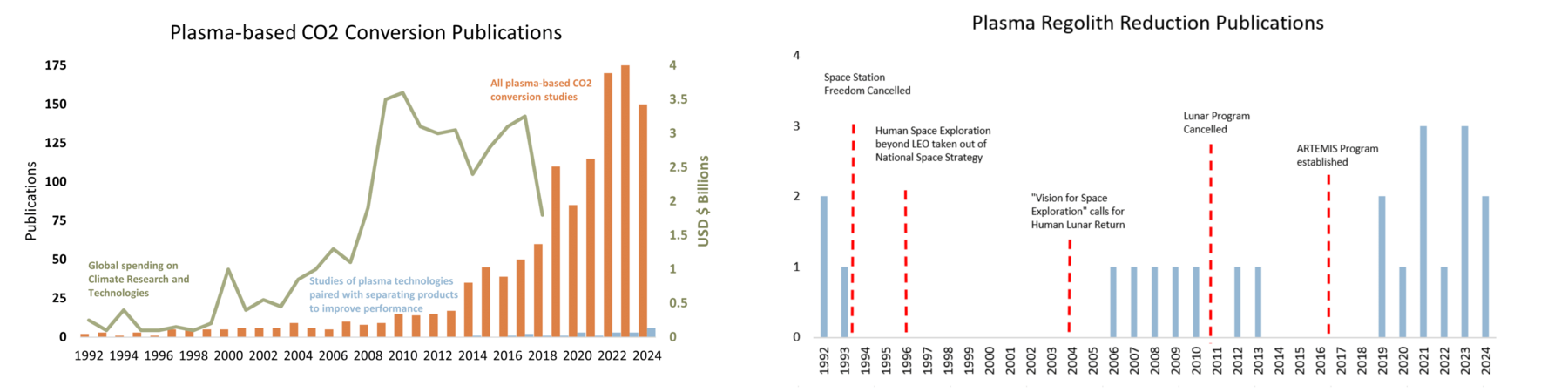 A publication analysis over time was conducted for studies relevant to the Lunar and Mars variant also using Google scholar, using key phrases like "plasma CO2 conversion," "plasma ISRU," "plasma regolith reduction." As shown in the figure below, the trend in publications involving plasma-based CO2 conversion (Mars variant) tracks well with increasing global funding on climate research and technology [16] because its initial conception was for point-source recycling of CO2 emissions or for carbon-utilization with direct air capture. Notably, the studies on separation technologies, which are typically energy-intensive with the resulting effluent mixture created by plasmas, are lagging behind studies of the plasmas themselves.