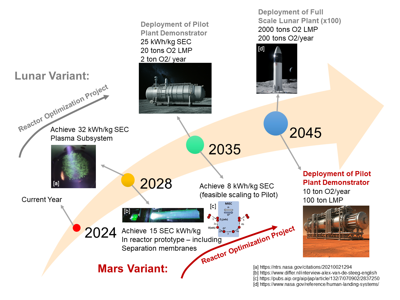 Our target is to develop a plasma-based oxygen generation architecture to capture the growing propellant needs on the interplanetary highway from the Moon to Mars, with an operational Lunar variant pilot demonstrator by 2035, a full-scale Lunar plant by 2045, and an operational Mars variant pilot demonstrator by 2045. To achieve the target of selling propellant at $500 USD/kg, a price estimated to be competitive with transport costs, the variants will need to see improvements in performance and scale that will be realized by investing in two R&D projects for each. The first are simultaneous reactor optimization projects for both variants which include several performance milestones designed to advance the technologies to TRL 5 and surpass the projected performance of other competing technologies, proving plasma as a viable method of propellant production to win government contracts. The second projects are pilot plant demonstrators scheduled to mirror NASA's Human Lunar Return and Humans to Mars phases of the Moon to Mars architecture and prepare for the future of space travel which will include multiple customers for ISRU-derived propellant.