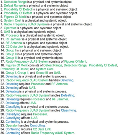 The above 2RFC tree shows the relationship between some systems related to the Counter UAS system that uses radio frequency as for detection and defeat. This tree says that the Counter UAS system consists of the detection system (3RFD), defeat system (3RFJ), classification & tracking system (3CTS), and command and control system (3CCS). In addition, these subsystems require several components such as an RF antenna (4RFA), RF jammer (4RFJ), a processor for classification and tracking (4CTP), command center (4CMC), and so on. As this DSM shows, The DSM indicates that each component is coupled to function as an RF counter UAS system.