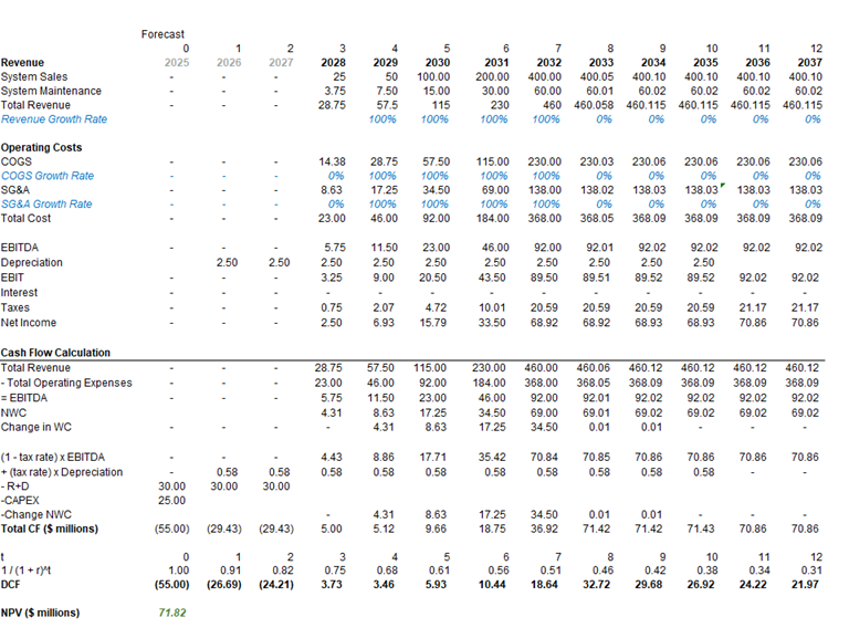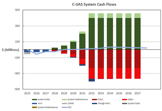 Our analysis is prepared from the perspective of a new entrant targeting fixed counter-UAS systems. We assess the total addressable product market is currently $1.2B, growing at a 24.7% CAGR, and forecast our future sales to be 6% of the market. Our discounted cash flows account for revenues from sales of C-UAS systems and recurring system maintenance, as well as research and development (R&D) costs, CAPEX required to build a sufficient manufacturing footprint, and operating expenses (COGS, SG&A, Working Capital) necessary to produce and sell our systems. Ultimately, this model projects a positive Net Present Value of $71.82M and our summary of cash flows and key assumptions are depicted below.