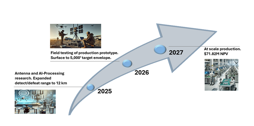 The technology strategy for our new Counter-UAS system focuses on leveraging advanced RF detection and defeat capabilities to effectively neutralize Group 1 drones in complex operational environments. By integrating cutting-edge signal processing algorithms with adaptive RF transmission techniques, the system will provide real-time identification, tracking, and disruption of drone threats omnidirectionally at ranges up to 12km and altitudes from surface to 5,000ft AGL. To launch this product in 2028, our company plans to invest Research and Development into high-gain, multi-band, and beamforming antennas as well as AI-powered signal processing. This will progress to a field prototype testing campaign in 2026 and will culminate with at-scale production of our commercial system in 2028.