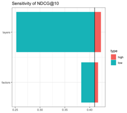 We can also model sensitivity using empirical results found in academic literature. Here we perform a sensitivity analysis on hit ratio (HR) and normalized distributive cumulative gain (NDCG) by varying two parameters that influence how expressive the model is: the number of latent factors for the user and item vectors, and the number of layers in the multi-layer perceptron.