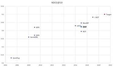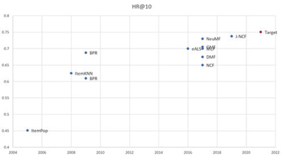The figures below shows a comparative summary of recommender systems across HR@10 and NDCG@10 FOMs.