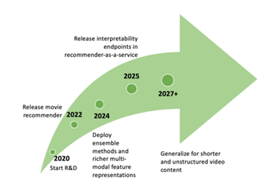 Our target is to develop recommender-as-a-service with an entry into the consumer market of 2022 with a target training time of 36 hours, hit rate (HR@10) of 0.75, and inference serve-time of 0.002 s. To achieve the targets we will invest in R&D projects that build out our offline batch computing and online serving capabilities. Because video analysis is computationally expensive and we expect to be able to leverage rich metadata (likely including natural language input) to learn more expressive representations, we must build out capabilities early on to batch-process input data and host complex models online. We will also build out the infrastructure for multi-phase modeling and active learning pipelines, and build interpretability tools to allow for human-in-the-loop audits of recommendations. With these targets in mind, we aim to offer recommender-as-a-service for feature-length film content by 2022, serial shorter-length video content by 2024, independent short-form video content by 2025, and short unstructured video content by 2027.