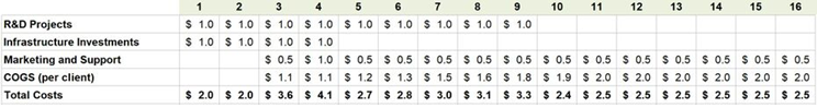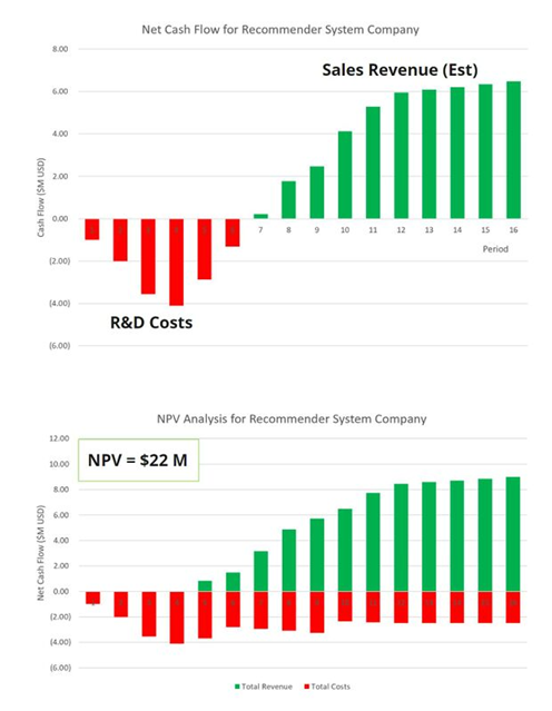 Recommender System Company (RSC Inc.) would operate as a service for clients seeking to derive actionable insights for their video-based assets. Clients would commission one-time or ongoing projects with RSC Inc. to design and deploy a customized recommender system based on their needs. RSC Inc. would leverage its state-of-the-art recommender system as the backbone for customization to client requests and data sets. Client projects would be custom priced, however, we envision three major tiers, roughly priced at around $100K, $500K, and $1M+ based on the complexity of the project, size of the dataset, and duration of support. We anticipate an initial upfront R&D spend to develop and refine a robust system of ~$2 M over 2 years to support the launch of an initial service focused on feature-length movies. We anticipate market expansion into develop additional types of video content including serialized video content (e.g., tv shows), independent video content (e.g., Youtube), and short video content (e.g., TikTok). Below we have included more detailed numbers for the estimated costs and revenues for the assessment period of Year 1 through Year 16 (each period is 1 year).