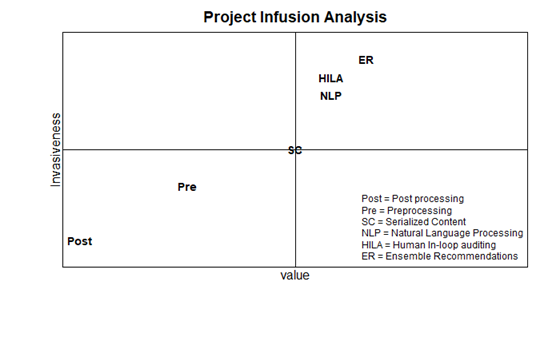 Based on the infusion costs we would recommend targeting the Serialized Content as well as the data pre/post processing projects as low risk projects. Of the 3 remaining, Ensemble Recommendations are the most impactful and so should be the "radical sustaining innovation" long term project.