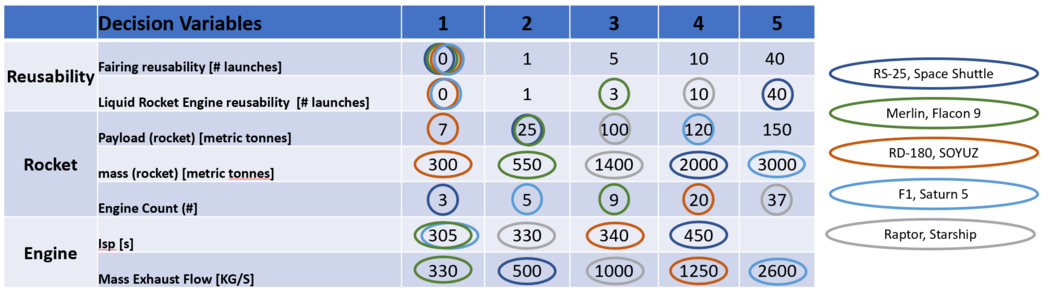 Based on the design decisions shown above one can see the variety of designs for achieving LEO. For example, notice that the Soyuz, RD-180 design employs 20 engines to lift a payload of 7 metric tonnes, while the RS-25 driven Space Shuttle uses just 3 engines to lift a payload of 25 tonnes.