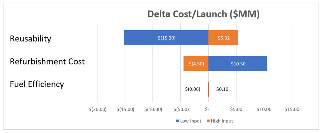 Early analysis of the trade space shows that cost/launch is most sensitive to re-usability and refurbishment cost.