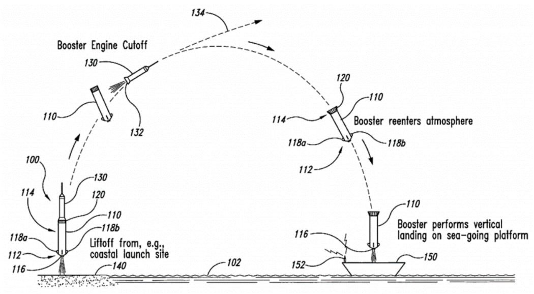 this patent (filed but not awarded) highlights the current state of patents and IP in the United States where patents can be tools to protect R&D investment as well as tools for trolling your competitor. The image below shows a patent filed by Blue Origin in 2010 for a reusable rocket design. The idea is simple, launch a rocket from the coast, drop the booster and land it on a sea-going platform. While this is a novel idea that has successfully been employed to reuse a booster, it just wasn’t Blue Origin’s idea. At the time the patent was filed SpaceX had already developed this technology and was actively making test flights. This example highlights how the patent system can be abused in a manner that “impedes innovation rather than encouraging it” (Urgelt).