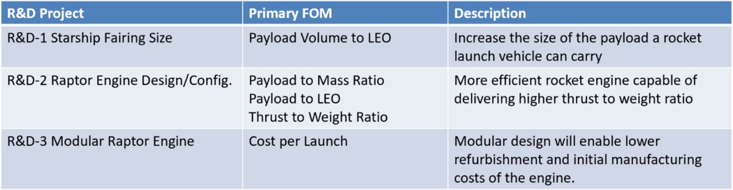 Our target is to develop a new rocket powered launch vehicle capable of delivering 150,000 kg by the year 2030 at a $/kg cost to LEO of under $300. This will be achieved through two R&D projects. The first project (R&D-2– Raptor Engine Design/Configuration) will increase rocket engine efficiency and employ a larger engine configuration on the launch vehicle. The second project, R&D-3 Modular Raptor Engine, will reduce refurbishment cost of the engines by employing a more modular design. Both of these R&D projects will be delivered in phases achieving half of the full-project benefit by 2025 (launch tested), and delivering the remaining value by 2030. Additionally, the company will be funding (R&D-1 Starship Fairing Size) which looks to increase the cargo bay volume on the new launch vehicle by 20% (diameter) by year 2030.