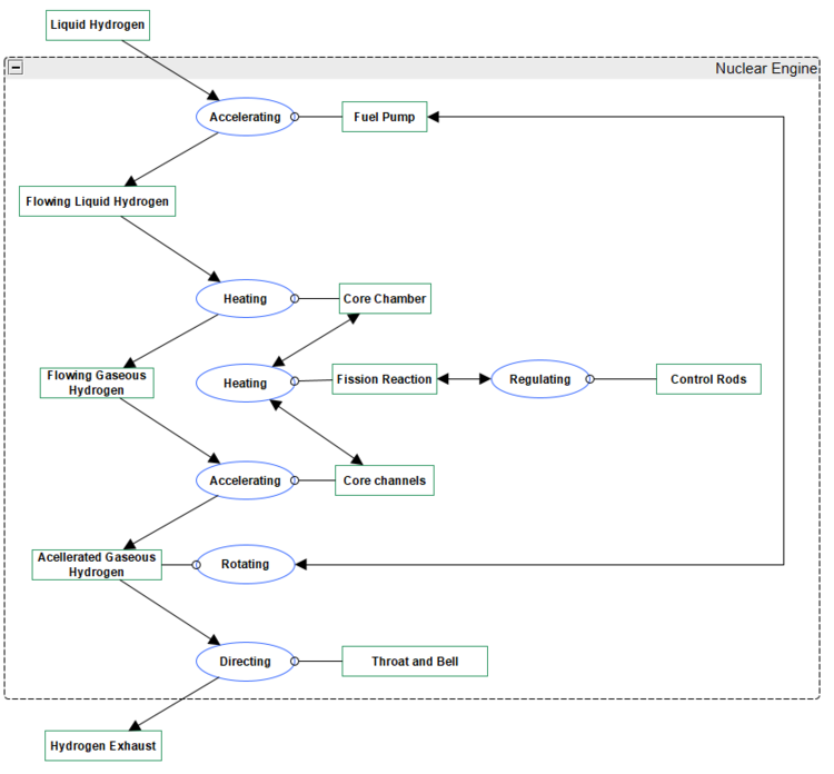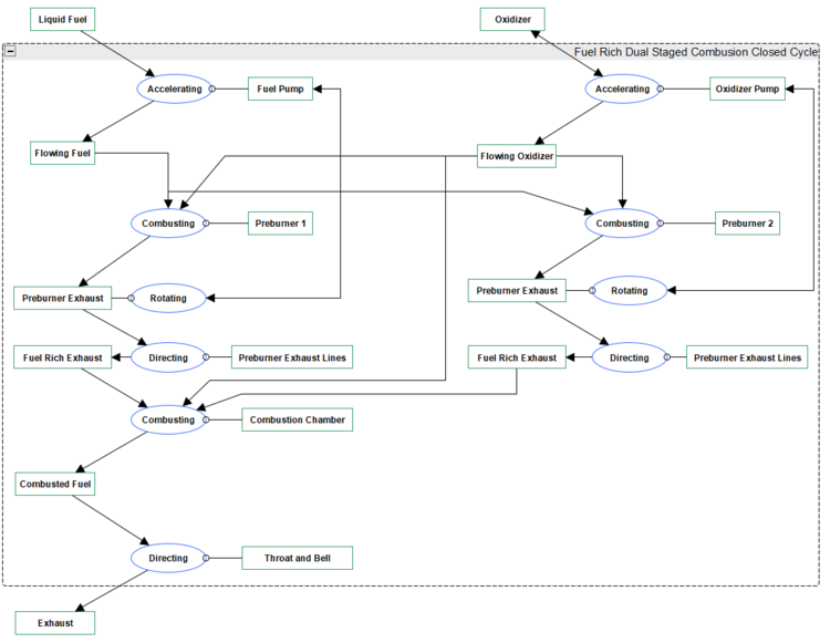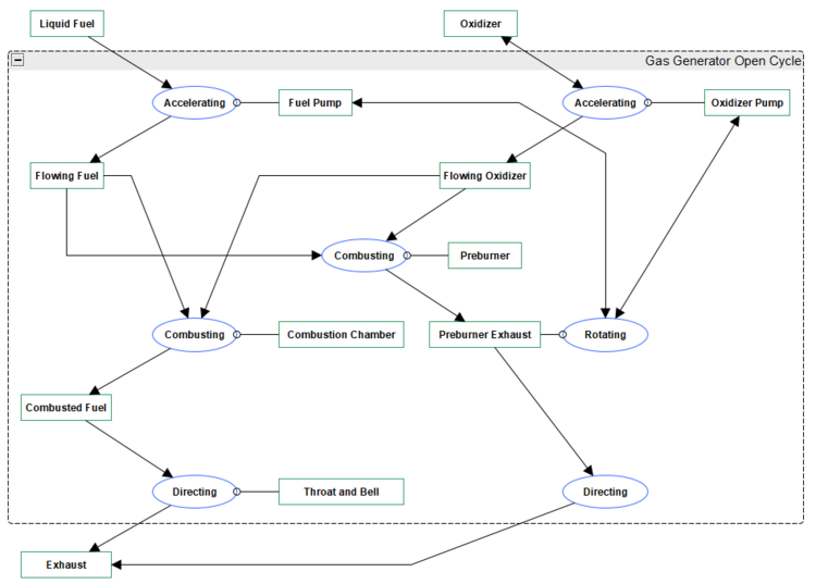 The primary function of rocket engines is to convert chemical energy to kinetic energy. This means that a rocket engine would be placed squarely on the cell “Transforming Energy” in our 5x5 technology matrix. There are several different styles of rocket engines that are used today (all of which meet the primary functional requirements) but the perform those functions in slightly different ways with slightly different architectures. These architectures are all determined by their fuel type and their fuel consumption method. The rocket engines we will examine here include: solid rockets, open cycle liquid fuel, closed cycle full flow liquid fuel, and nuclear. Below is a generalized OPD describing the operation of a liquid fuel rocket engine.