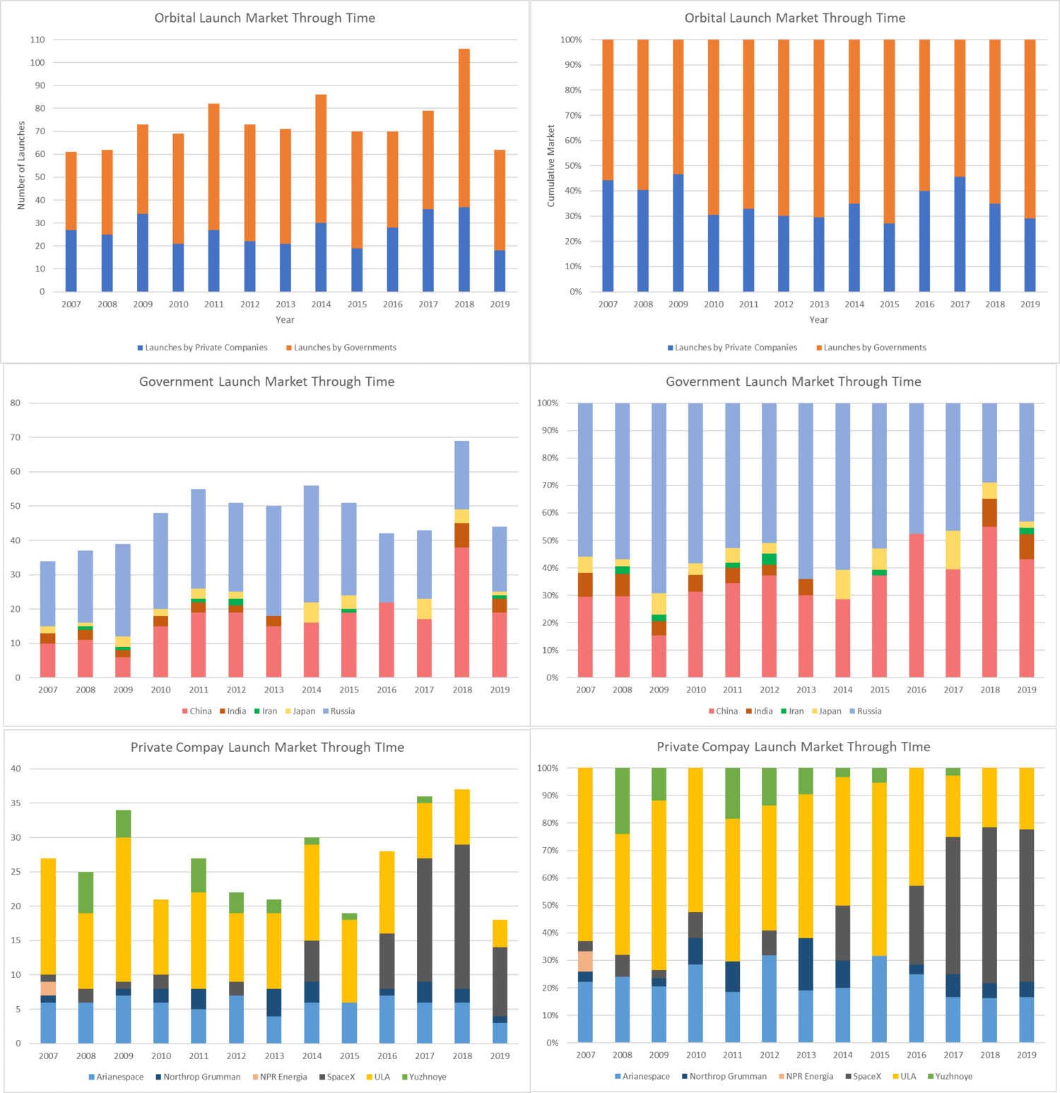 At the highest level, there are two semi-competitive solutions – governmental funded agencies and private companies. Publicly funded agencies are nation specific, and account for between 50% and 75% of all orbital class launches annually. For orbital class launch vehicles, China, India, Iran, and Japan utilize exclusively publicly funded organizations. Russia uses almost exclusively publicly funded organizations with rare exceptions. Chinese and Russian launches together account for ~90% of all publicly orbital class launches in the world on an annual basis. The remaining 50% to 25% of all orbital launches annually are publicly and privately funded but launched by private companies.