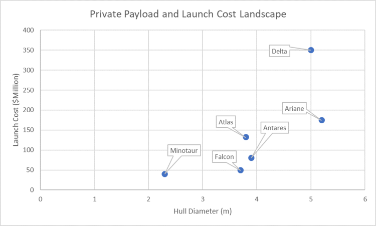 SpaceX continues this strategy of attack and pioneering by developing the Starship platform. No firm claim for launch costs have been settled on for Starship, but it will have payload capacity of ~100,000 kg and a diameter of 9m dwarfing every other private provider option. Estimates for cost range from gobsmackingly low ($10 million – Elon Musk at the IAC 2017) to shockingly low ($100 million – Business Insider estimate). If the real cost per launch is in that window, then Starship paired with Falcon 9 will become dominant designs.