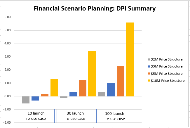 The first pricing scheme that was considered is $10M per launch – the high-end public estimate by the company. $5M and $3M provide interesting intermediate points, and $2M represents a low-end estimate of what would be charged to the customer. There is a complex relationship that relates launch cadence and viable re-usability amounts (10, 30, and 100 re-flights were modeled) but the results are unsurprising nonetheless. With increased launch cadence and higher reusability all pricing schemes improve in both NPV and DPI.