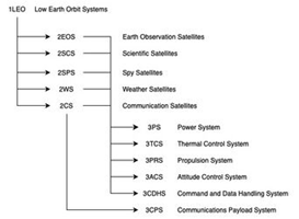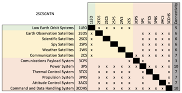 For the DSM allocation, the Level 1 roadmap was chosen as Low Earth Orbit Systems; this was a strategic choice to focus on technologies being developed with this particular orbital region in mind. However, it is understood that there will be links to roadmaps for systems in MEO and GEO. Working down the decomposition, the Level 2 roadmaps would align with the application-specific satellites. Finally, the Level 3 roadmap focuses on the individual subsystems. What can be appreciated from this connectivity is that 3PS, 3TCS, 3PRS, 3ACS, and 3CDHS are all common subsystems across all satellite classes. This indicates that the underlying technologies for these subsystems can come from different application domains, and improvement in any of these subsystems via one domain will improve the technology for all domains.