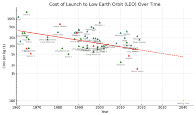 As the direct-to-device communications industry is nascent and many companies do not disclose many of the specifications of their constellations, it is challenging to come up with quantitative measures of the trends. One big exception is Launch Cost, as this data is public, trends over the last 60 years are shown in the diagram below (the graph is plotted on a logarithmic scale). As of 2024, the best-reported launch cost is from Falcon Heavy at $1500/kg. This is a significant reduction from the early days, but it is still 15x higher than the 2040 NASA target of $100/kg. The caveat with this goal is that the time value of money is not clear. It is not explicitly stated whether NASA accounted for a launch cost of $100 at the time of setting their goal or if this cost is assessed in terms of its adjusted value to 2040 dollars.