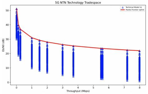 What is appreciable from the graph is that the uplink is significantly more limited than the downlink, so any future system will really need to focus on improving the uplink throughput FOM in order to have a good QoS (Quality of Service). Furthermore, it is clear that there are a number of concepts that live on the Pareto front, with AST performing well on a balance of Eb/N0 to Throughput for both uplink and downlink. As this is a nascent technology, we expect these Pareto front curves to shift toward the top right. Due to the lack of available information, one of the major limitations of this tradespace comparison is that it assumes the same modulation schemes for all of the satellites.