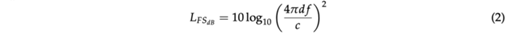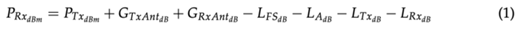 Where PRxdB is the received power, PTxdB is the transmitted power, GTxAntdB is the transmitting antenna gain, GRxAntdB is the receiving antenna gain, LAdB is the atmospheric loss, LTxdB and LRxdB are the transmitter and receiver dissipative losses respectively, and LFSdB , is the free-space path loss, defined in (2) as