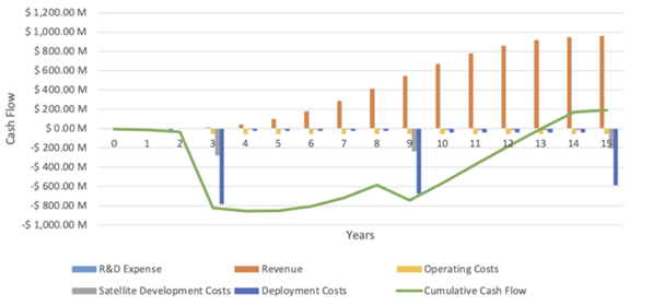 The cash flow of the project is shown in below. As can be seen from the graph, the initial R&D investment is a small fraction of the project costs. This is because the modeled system is comprised of a large number of relatively small LEO satellites. The development of a single LEO communications satellite is estimated to cost $40 million over the first 3 years of the project, after which the system can be scaled up and the constellation can be deployed. In our model, T = 0 is considered for the year 2025.