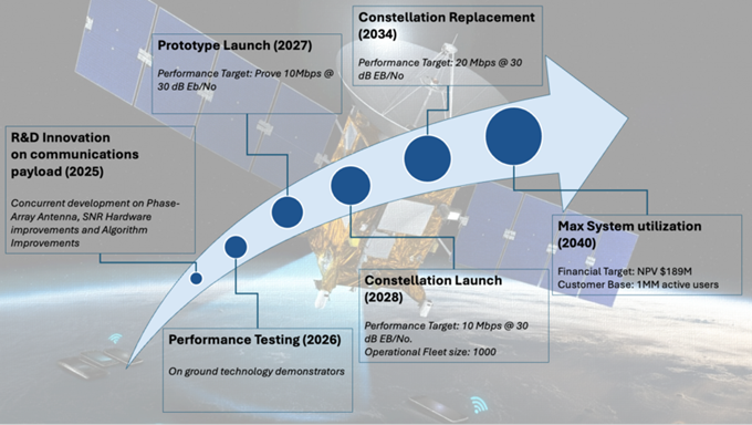 We aim to develop a new LEO Communications Satellite Constellation that uses the 5G NTN standard to achieve direct-to-device communication with unmodified cellular devices with a 10 Mbps data rate by 2028 and 20 Mbps by 2034. We will invest in three major R&D projects to achieve this data rate. The first is to develop a phased-array antenna that can beamform and perform spatial multiplexing; the second is to develop an improved Low-Noise Receiver; and the third is an algorithmic endeavor to optimize the software DSP techniques. Alongside the R&D initiatives, there will be three demonstrator projects: an OTA demonstrator, a Software-Defined Radio Receiver Demonstrator, and a final Satellite Bus integration demonstrator. These projects and demonstrators will be critical to achieving our Eb/N0 target of 30 dB and eventual data rate of 20Mbps.