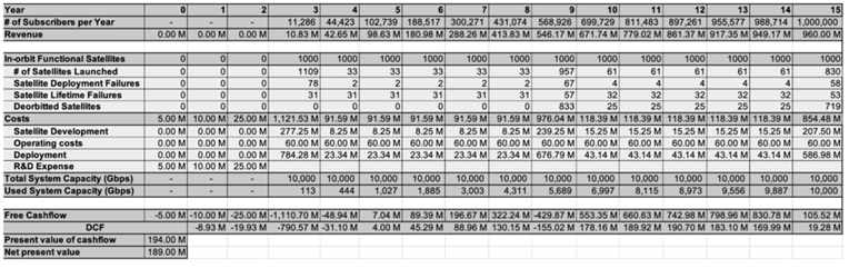 where FD is the final demand at tmax (year 15 in our model) and x is the normalized time base (current year/tmax. The price per 1 Mbps of throughput per month is set to $8, which is less than the competition but still provides healthy project margins). Since direct-to-device communications do not require ground stations and their management, the operating costs are minimal and estimated to be $0.5 per Mbps. The cost per satellite (bill of materials, labor, and testing) are estimated to be $250,000, in line with current StarLink satellites [3]. The remaining parameters are also estimated based on the current technology pricing. The discount rate is assumed to be 12%.