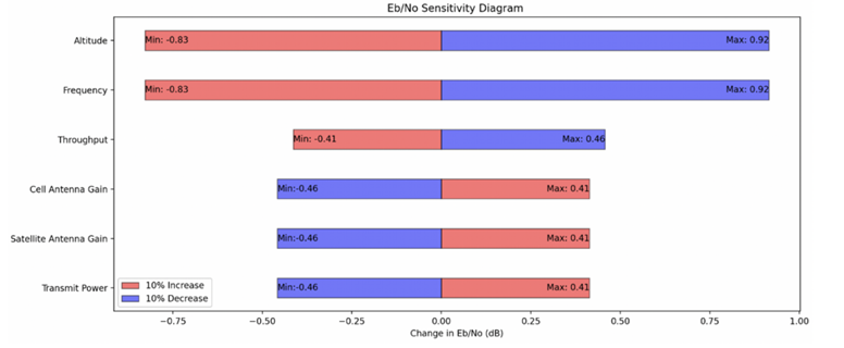 To assess the sensitivity of Eb/N0dB to all the model variables, the nominal Eb/N0dB value was first computed based on the nominal data. That became the reference value for the sensitivity analysis. Then each model variable was perturbed by 10% from the nominal to construct the tornado diagram shown below. The throughput FOM is used as one of the variables as it is used to compute the Eb/N0dB value. As can be seen in the figure, a 10% increase in the altitude (in LEO orbit) or frequency will result in approximately 1 dB of drop in Eb/N0dB. By contrast, increasing the antenna gain for either the satellite or the cell will improve the Eb/N0dB by almost 0.5 dB.