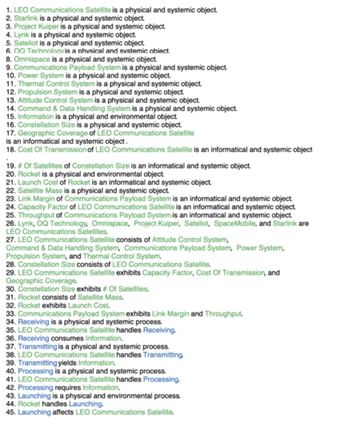 The diagram below shows the Roadmap OPM for SC5GNTND2D; it captures the main object (LEO Communications Satellite) FOMs (Cost of Transmission, Capacity Factor ...), major functions (receiving, transmitting, processing), subsystems (Communications payload system, power system, ...), and competitors (Lynk, Starlink, SpaceMobile...). For completeness, the OPL description of the roadmap is included below; it describes the same content as the OPM in a formal language.