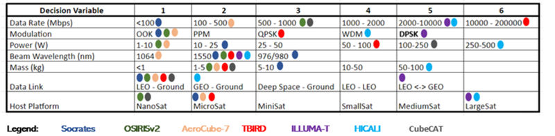 Shown below is a morphological matrix for satellite laser communication. This table can be used to map trends in design choice across key technical parameters related to this technology: