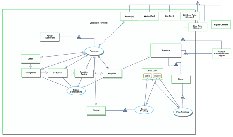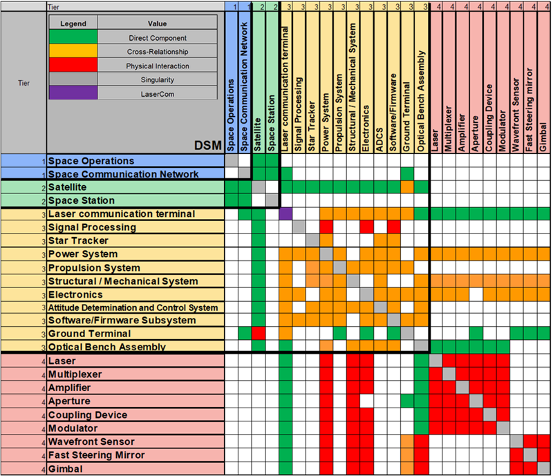The Design Structure Matrix also provides access to the part-level componentry that makes up the LaserCom system. This Tier 4 componentry is common across satellite LaserCom systems and combined they provide access to the basic LaserCom functionality. The general individual functions of these components are as follows: