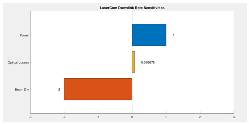These results show the relative, normalized sensitivity of EIRP and therefore downlink data rate have to the Power, Beam Divergence, and Internal Optical Losses design FOMs. They show that of these figures of merit, the Downlink achieved is most sensitive to the beam divergence Θdiv. This value is negative because it varies inversely with EIRP, it also levies twice the effect of PT on EIRP, because the Θdiv term is squared. The other terms have positive normalized sensitivities because they vary more directly (in the numerator) with EIRP. The Laser Transmitter Power PT is the second most sensitive. The variation in internal optical losses τT has the least effect on EIRP and Downlink Rate when evaluated at design vector x0. This occurs mathematically because of its fractional dB value in the exponential term in the EIRP equation. These sensitivity values and charts are particularly useful to informing the LaserCom terminal design. Pinpointing a minimal Θdiv and maximizing PT allows will allow the EIRP to reach a max and maximize the LaserCom terminal design all else equal. Some fine tuning can be done by keeping optical losses to a minimum, but shouldn’t lead the design effort as a primary target.
