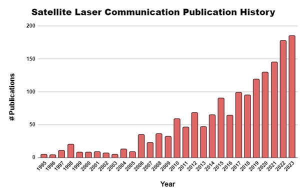 Seen below is the publication history trend of "Satellite Laser Communication" taken from Google Scholar. Notable features in the history come from revolutionary lasercom projects being launched and published on. The spike in 2006 was a result from the first LEO ISL demonstration with the OICETS program operated by JAXA. The bump in 2010 came from prelaunch planning and analysis of NASA's LLCD after the contract was awarded and preliminary findings were published. Into the late 2010s, publications were rapidly increasing and the field hit 100 publications/year in 2019, the same year project TBIRD was announced and preflight analyses were shared with the community. Overall, the recent boom in articles is a promising sign for the field as satellite lasercom technology progresses from an early demonstrator to a mature R&D capability.