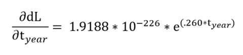 Lastly, the derivative of Eq. 1 can be taken to get the instantaneous δdL/δt of this trendline. Calculating this derivative (which is actually super easily for e^x, just apply chain rule) yields: