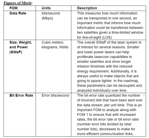 The driving Figure of Merit for lasercom is data rate, particularly the satellite downlink data rate in which the satellite sends information it has collected to the ground station on Earth. A key motivator for pursuing the development of Lasercom technology is to create higher throughput data links in space, beyond what has been available through traditional radio frequency communications. Lasercom allows for a drastic multiplication of downlink data rates, for example a satellite operating at a ~100 mbps downlink is on order for a high performance RF DL link on a large satellite in the X-band and there are plans to attempt a 2 Gbps X-band link, while NASA and MIT Lincoln Labs TBIRD 6U CubeSat has used lasercom to demonstrate a 200 Gbps downlink. Albeit the comm window is much smaller as the satellite has much more precise pointing requirements and atmospheric conditions than RF comm payloads. Even amongst this more stringent communication window lasercom allows a program to collect 10x - 100x more data that of RF based satellite systems: https://www.nasa.gov/communicating-with-missions/lasercomms/ This multi-order throughput result drives the case of lasercom in the data rate figure of merit. It proves lasercom systems to be highly desirable satellite capability as it has opened up what has historically been a bottleneck of satellite information transfer through restricted communication capabilities.