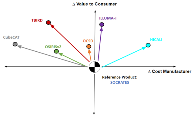 To illustrate the progression and development of satellite lasercom technology, a vector chart was populated with the R&D projects discussed above. The SOCRATES mission was selected as a baseline, being the earliest technology in this analysis. Many of the systems focus on LEO-Ground links, and are stronger comparisons with the baseline. The Aerospace Corporation-made AeroCube-7-OCSD showed improvements in all FOM over that of the baseline, leveraging recent advancements in smaller, more efficient technologies. Through the flight test of OsirisV2 by DLR, a higher data rate was accomplished on a much smaller platform (NanoSat class). The small form factor and higher data rate prove to be valuable to the customer, opening up new communication capabilities without the system occupying much bus space. This roadmap contains much discussion on TBIRD but the relevant points for this comparison are emphasis on very high data rates and low-cost production with primarily COTS parts to increase value. The proposed CubeCAT terminal is looking to take key aspects of the two previous projects with a high data rate output from a NanoSat class payload. Targeted for high volume production, this asset is meant to drive down production cost while provided competitive performance.