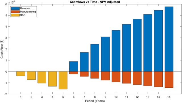This analytical approach for modelling NPV can then be extrapolated to be representative of a Satellite manufacturing company, rather than a research facility in the prototyping phase. To do this, the number of satellites input must be modified to sat = 50 Satellites to be more representative of the different business model and strategic aims of a for-profit business. This will also show that the NPV and the NPV/sat are greatly improved with this approach as the revenues eclipse the non-recurring costs of initial R&D investment. These Modified results are included below: