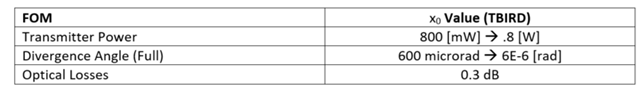 This is the governing equation that will be analyzed and normalized to calculate the sensitivity of downlink data rate for inputs Power [W], Beam Divergence [rad], and Optical Losses [dB]. These sensitivities will be analyzed at vector x_0, which is based on values of the FOM metrics pulled from the TBIRD Mission and are included below:
