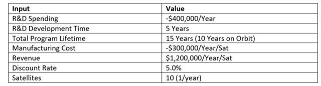 The approach used for this Net Present Analysis was to estimate the monetary inputs for a research facility demo-ing and prototyping a total of 10 satellites based around Lasercom was to reference the recent Starlink program itemized costs for their constellation of 5000+ and counting satellites. Basing R&D and Manufacturing/Maintenance costs and Revenues from Starlink and normalizing the costs to a per satellite unit price, offers a nice first order approximation for the inputs to a Lasercom Satellite NPV analysis. These basic cost values could then be coupled with Smallsat and Low Earth Orbit specific input values that are representative of an early LaserCom Demo and tech transfer initiative from a FFRDC such as Lincoln Labs or JPL to better replicate a Mission such as TBIRD (the mission often referenced elsewhere in this roadmap). The unitized input values used for the first NPV analysis were as follows: