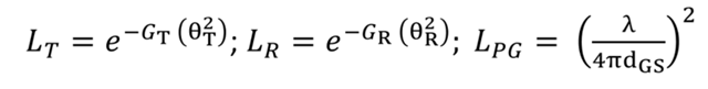 These loss variables are derived from the mathematical definitions of each loss contributor. Where G_T and G_R are the transmitter and receiver gains, Θ_T and Θ_R are the transmitter and receiver pointing errors [radians],λ is the laser source wavelength [nm], and d_GS is the "slant range" distance [km] between the ground station and LaserCom Satellite.